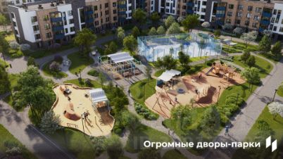 Благоустройство масштабное закрытое пространство, спроектированное как городской парк для всей семьи сенсорные сады с обилием зелени, релакс-зона, площадки для баскетбола, футбола и волейбола, детские игровые площадки из природных материалов.
