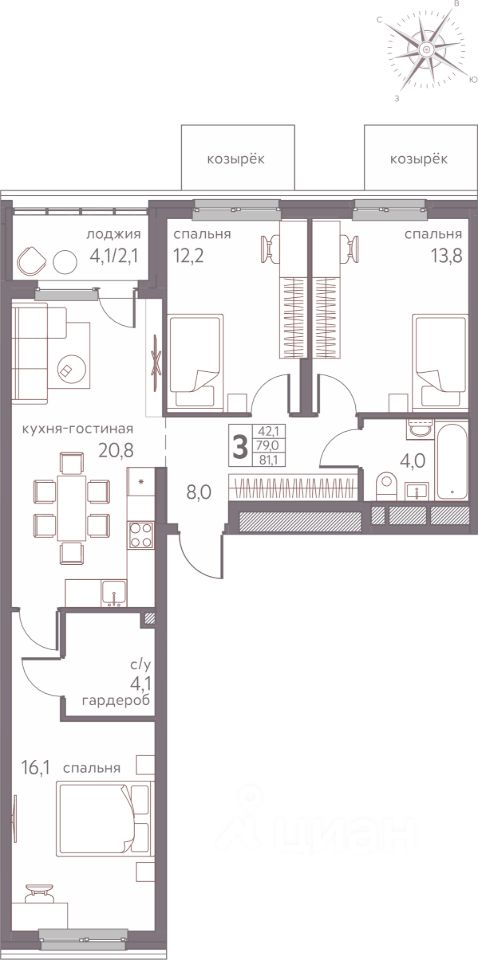 Продаётся 3-комнатная квартира в строящемся доме (Серебристая, 3), срок сдачи: III-кв. 2026, общей площадью 81.1 кв.м., на 2 этаже. Теплые кварталы "Погода" — это новый грандиозный проект от создателя Спортивного микрорайона "Ива", федерального застройщика "Девелопмент-Юг" .