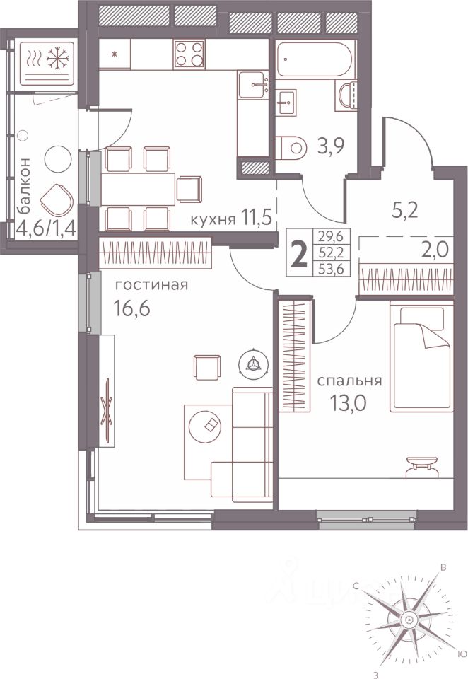 53,6 м²
