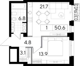 Красивый сценарий жизни в квартире открытой планировки* площадью 49.9м2 в клубном доме Строганов на Пермской 86. *Резиденты могут воспользоваться готовыми планировочными решениями организации пространства.