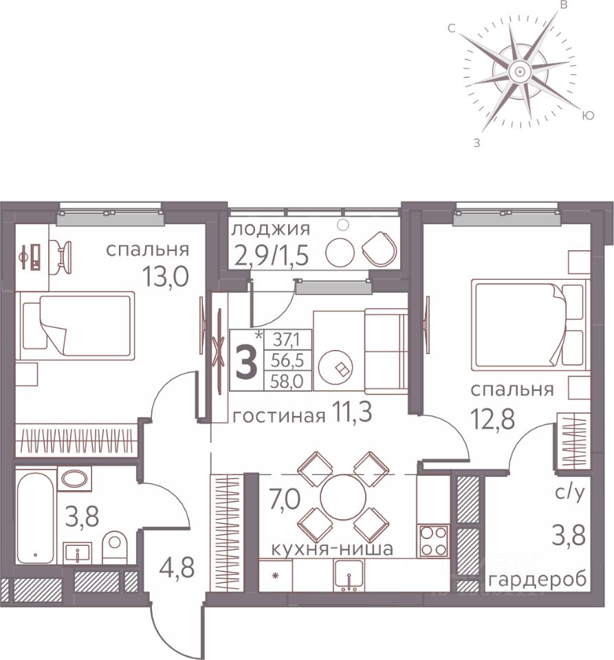 58 м²