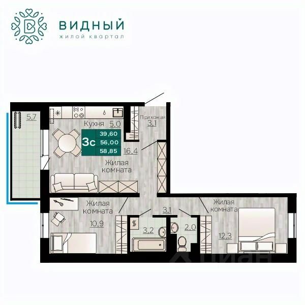 Общая площадь58,85 м²