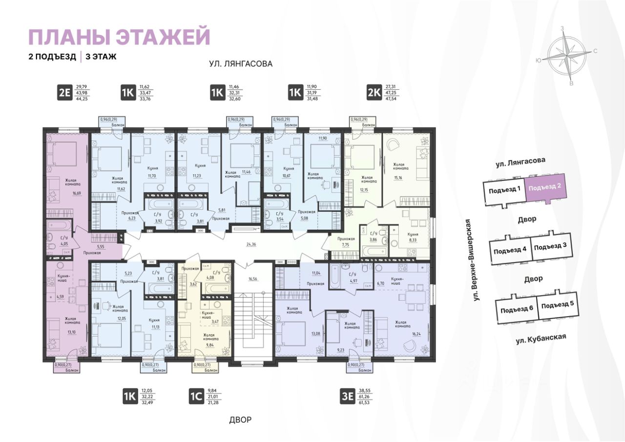 Стильные подъезды выполнены по индивидуальному дизайну. Предусмотрено место для хранения колясок, в 4 подъезде - колясочная. Подъезды оборудованы домофонами, расположенными в тёплых тамбурах. Витражное остекление входной группы позволяет увидеть то, что происходит во дворе.