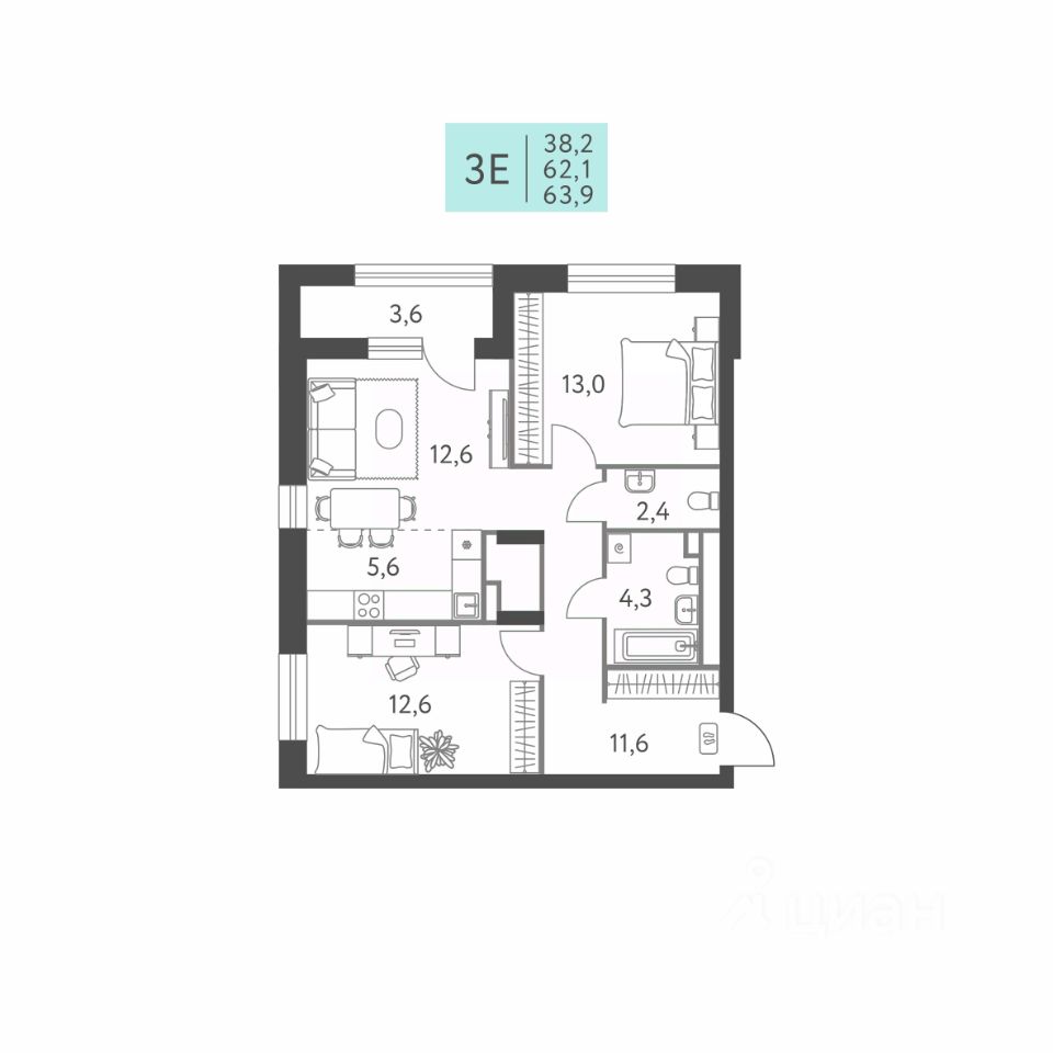 Общая площадь63,9 м²