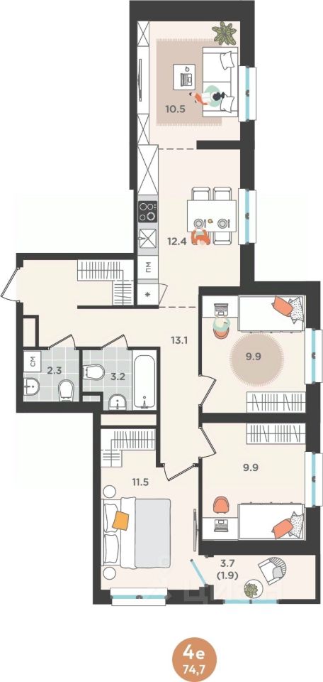 Общая площадь74,7 м²