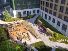 На территории предусмотрено несколько функциональных зон, где каждый найдет себе занятие по вкусу: для самых маленьких — большая песочница и навес, под которым можно спрятаться от солнца; для ребят постарше — любимые во все времена игры, разметка для которых уже нанесена на асфальт: классики, змейки. Подростки с удовольствием поиграют в настольный футбол, а взрослые отдохнут на шезлонгах вдали от дворовой суеты. Попасть на крышу можно прямо на лифте.