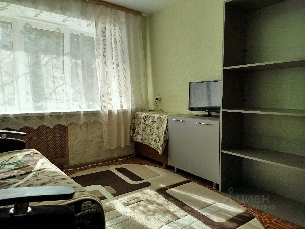 — удобный диван, шкаф-купе, стол, полки