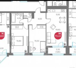 Площадь: 70,45 м² | 3 комнаты (европланировка)