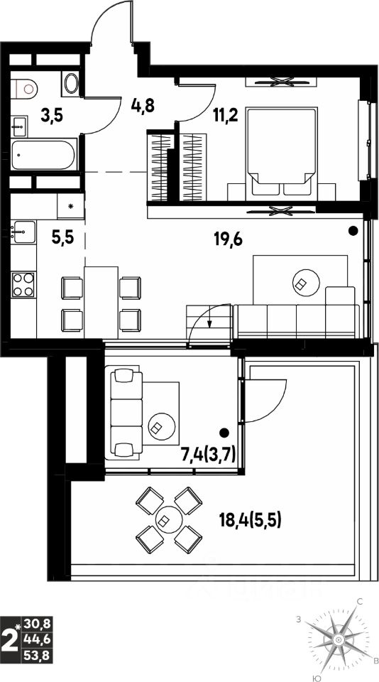 53,8 м²