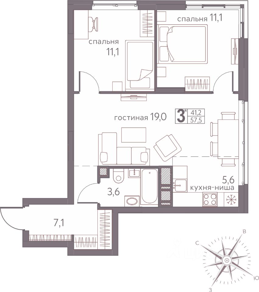 57,5 м²