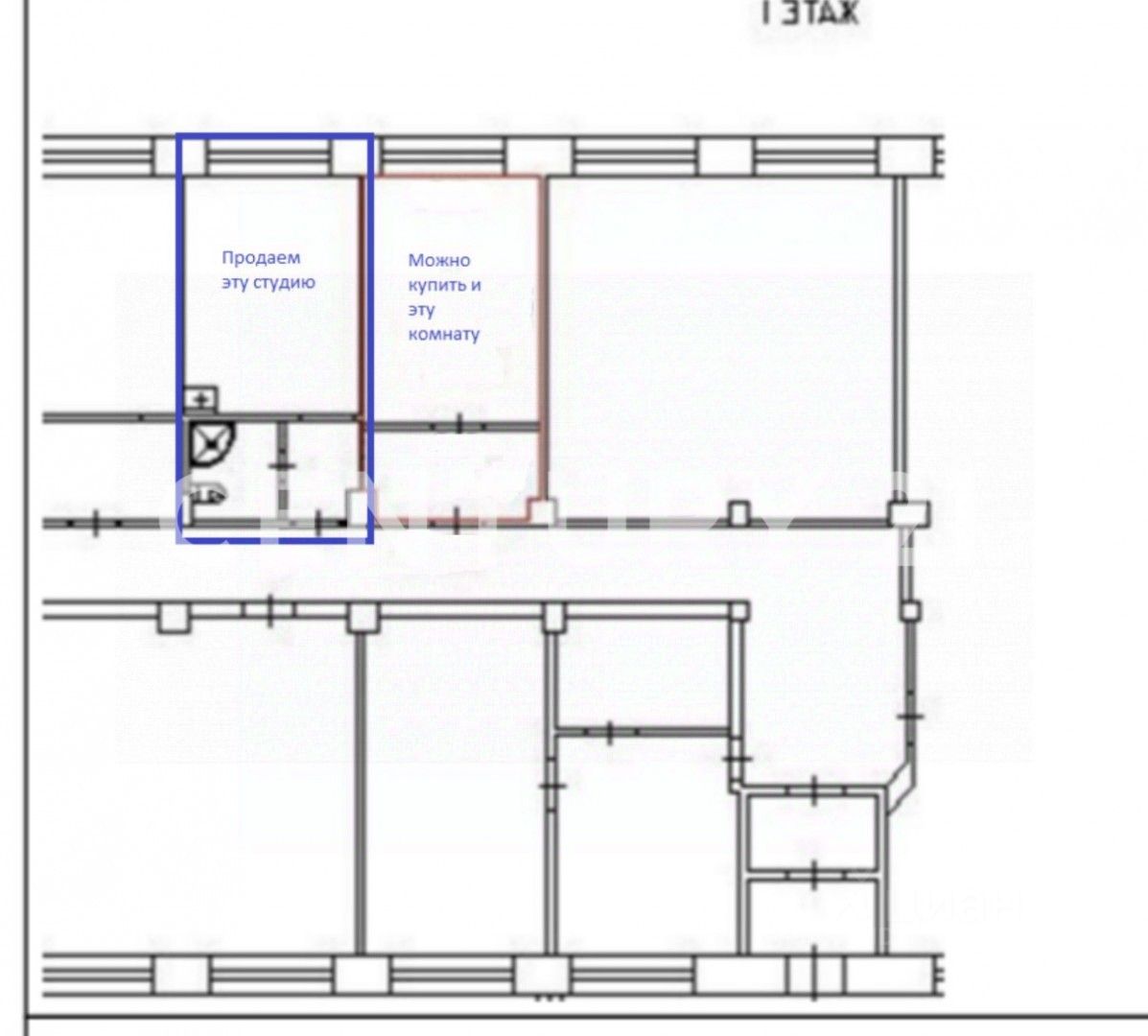 Возможность обустройства кухни: в комнату заведена вода и канализация.