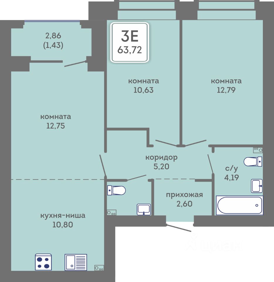 Общая площадь63,72 м²