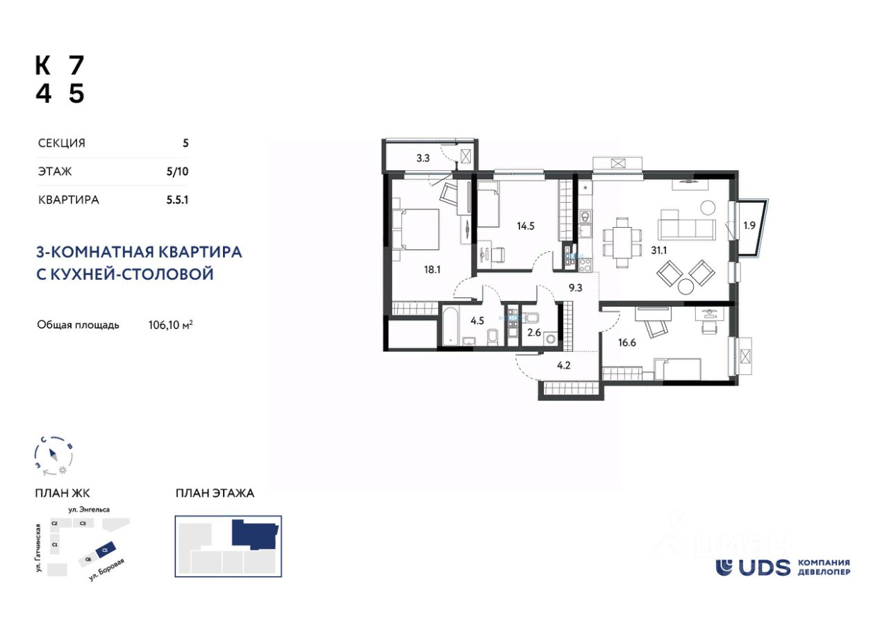3 спальни, просторная гостиная и личное пространство в Квартале 745 идеальный выбор для семьи с двумя детьми.