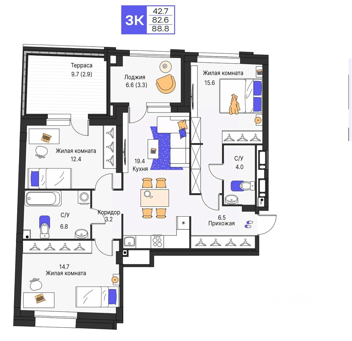 • Большой выбор планировок от студий до квартир с террасами