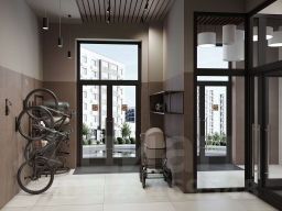 Концепция проекта продолжается интерьером лобби. Здесь преобладают естественные оттенки и текстуры, а мебель выполнена из экологичных материалов. Для удобства жителей созданы собственные колясочные и велосипедные, а для заботы о домашних любимцах предусмотрена лапомойка.
