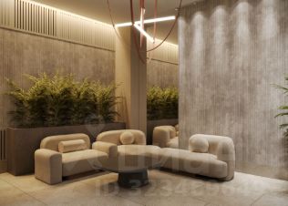 Концепция проекта продолжается интерьером лобби. Здесь преобладают естественные оттенки и текстуры, а мебель выполнена из экологичных материалов. Для удобства жителей созданы собственные колясочные и велосипедные, а для заботы о домашних любимцах предусмотрена лапомойка.