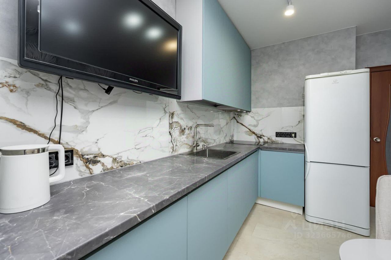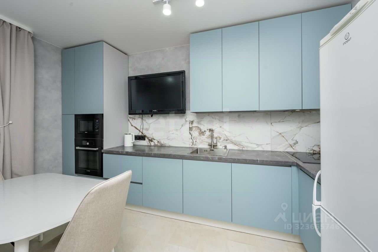 При продаже остается качественный кухонный гарнитур со встроенной техникой.