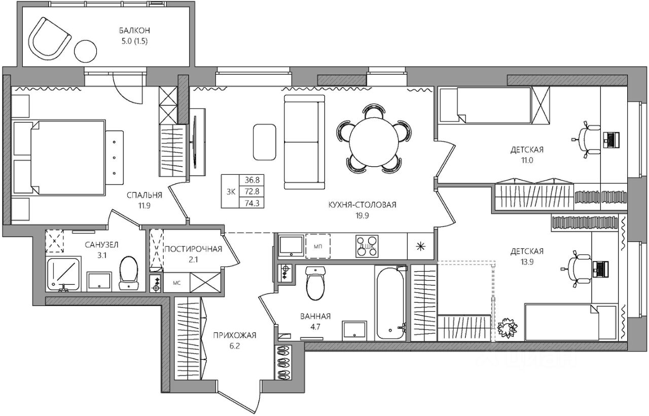 Общая площадь74,3 м²