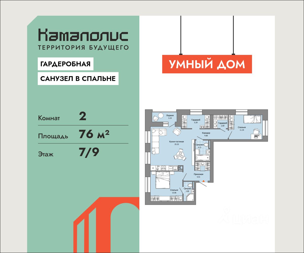 В новом жилом комплексе комфорт+ класса "Камаполис", расположенном на берегу реки Камы, продается 2-комнатная квартира площадью 76.00 кв. м. Квартира находится в 4 доме. Девелопер проекта - "Железно".