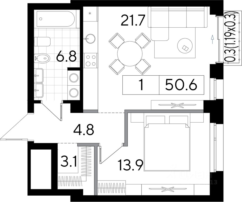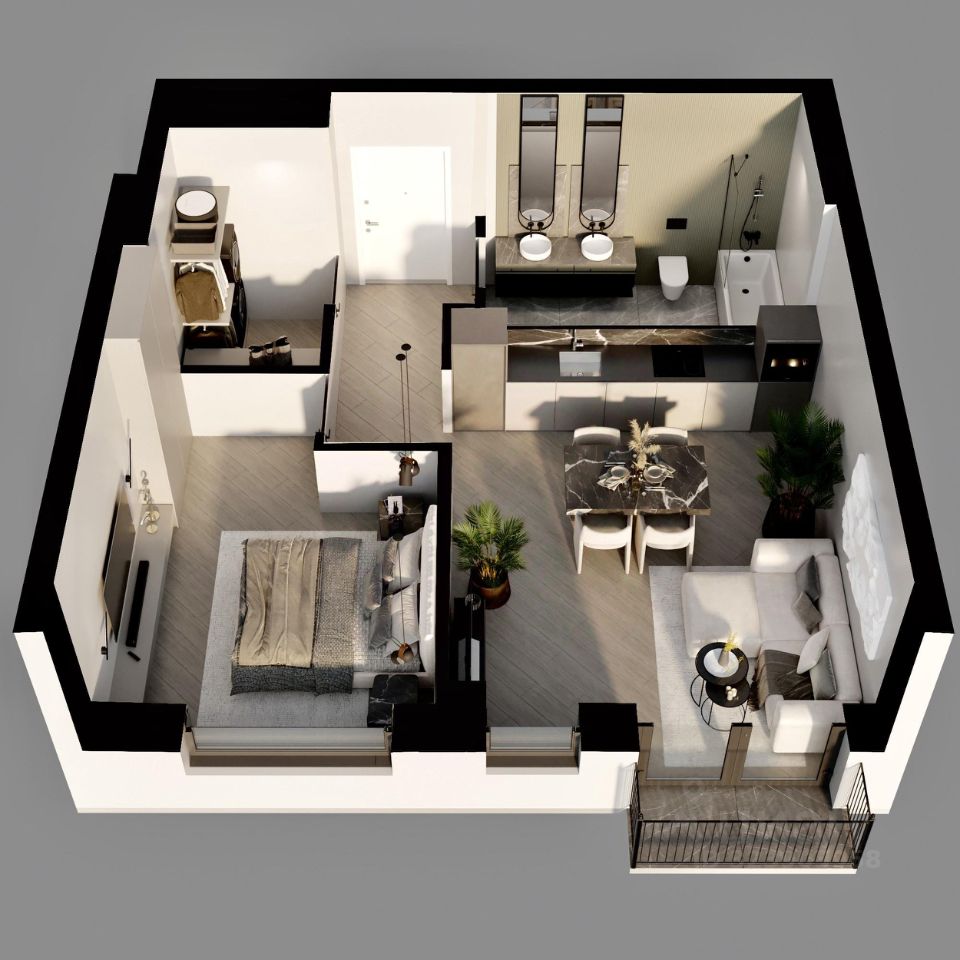 Красивый сценарий жизни в квартире открытой планировки* площадью 49.9м2 в клубном доме Строганов на Пермской 86. *Резиденты могут воспользоваться готовыми планировочными решениями организации пространства.