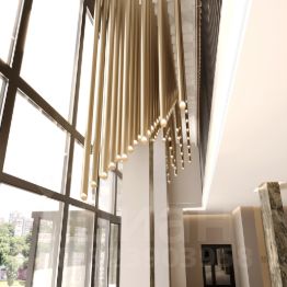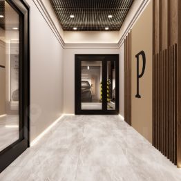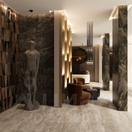 Деликатную элегантность и уют интерьеров дома подчеркивает природная палитра камня, стекла и дерева в отделке. Их дополняют стеклянный атриум лобби, трековое освещение и контурная подсветка.