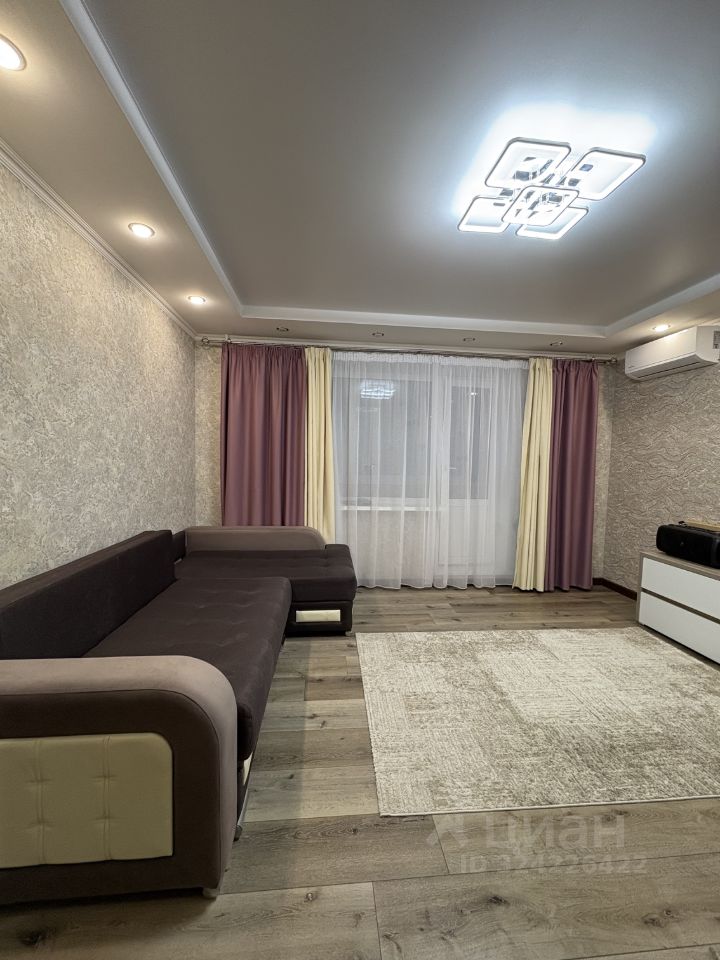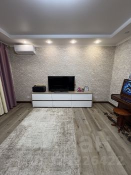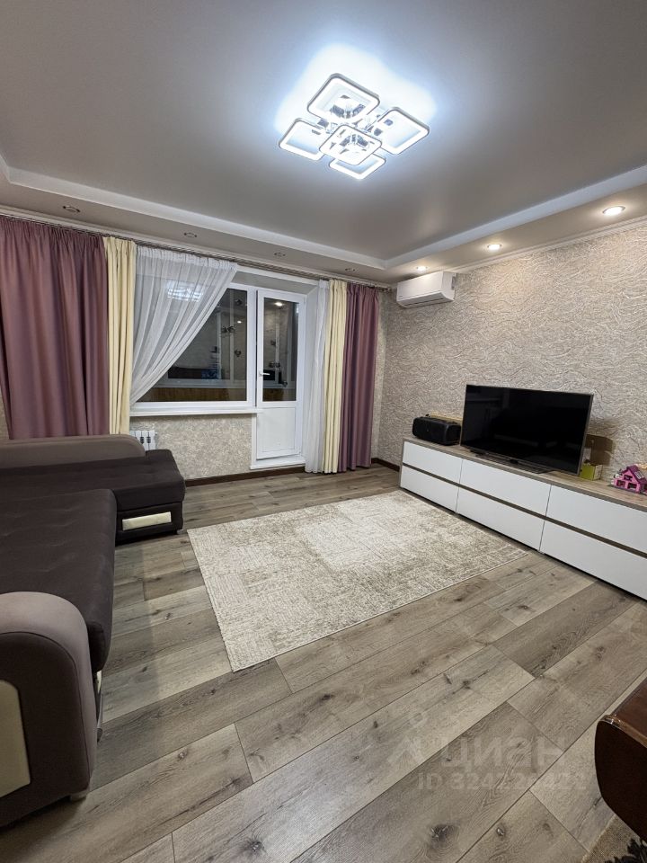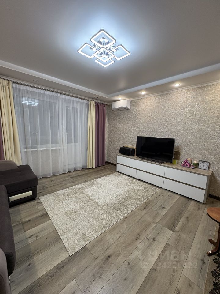 Гостиная: Просторная и светлая, с угловой лоджией, остекленной и утепленной. Стены выдержаны в нейтральной гамме, дополнены акцентным освещением. Установлен кондиционер.
