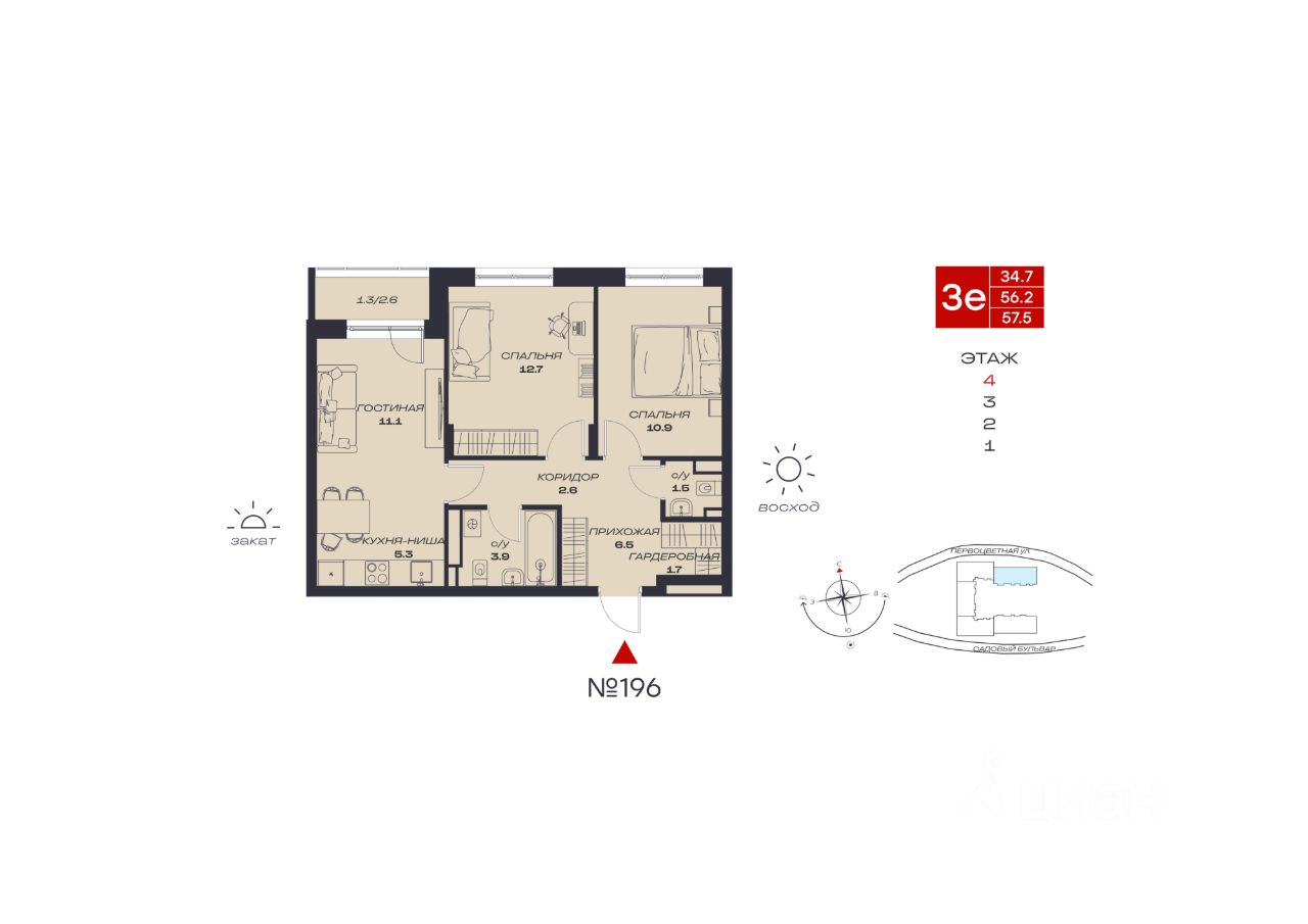 Продаётся 3-комнатная квартира в строящемся доме (Садовый, 73), срок сдачи: IV-кв. 2027, общей площадью 57.5 кв.м., на 4 этаже. Новый жилой комплекс "Миниполис Култаево Парк" от Специализированного застройщика "Миниполис Култаево Парк" расположен в с. Култаево по ул. Садовый бульвар.