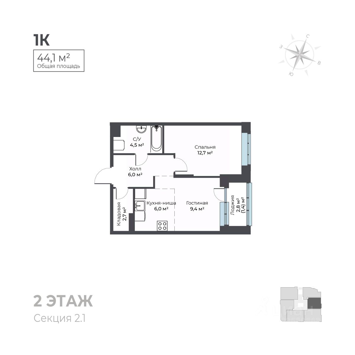 Общая площадь44,1 м²