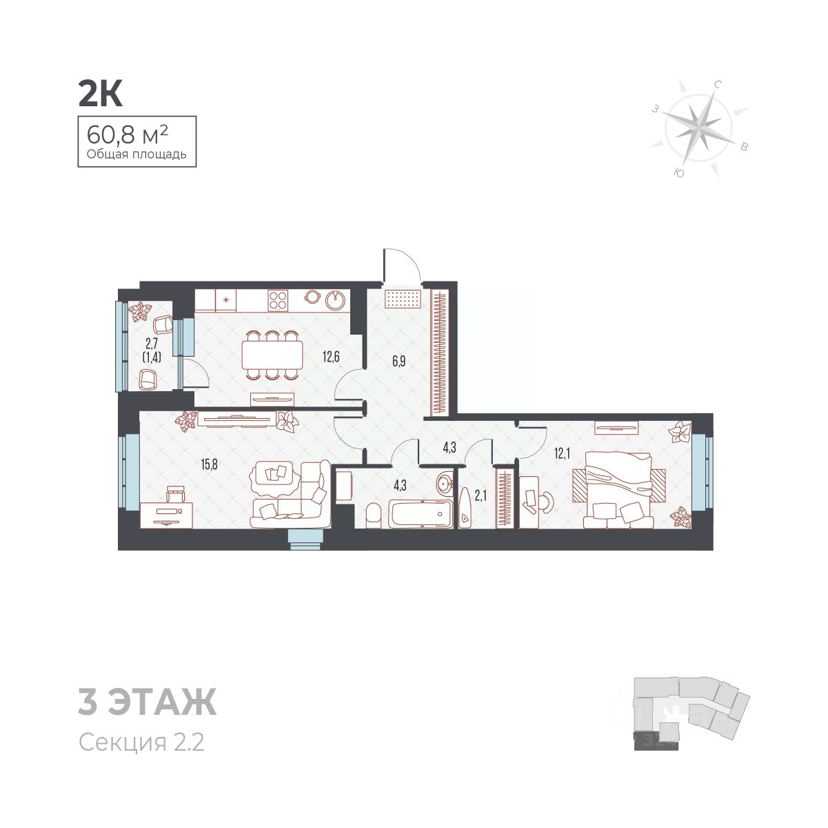 12,6 м²