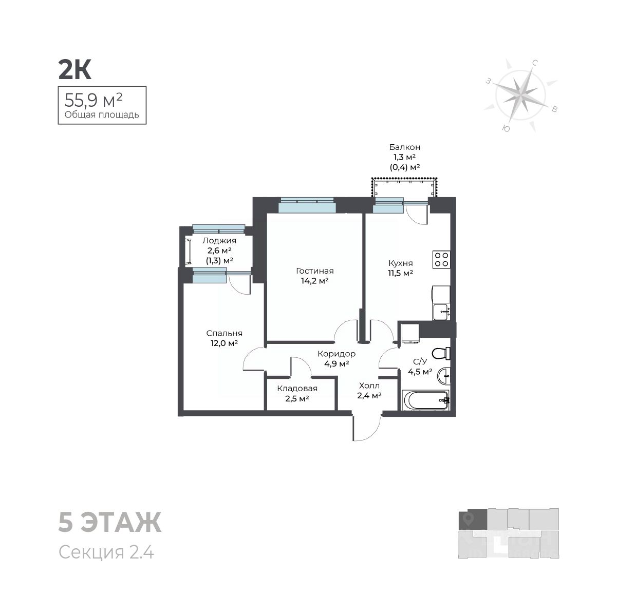 55,9 м²