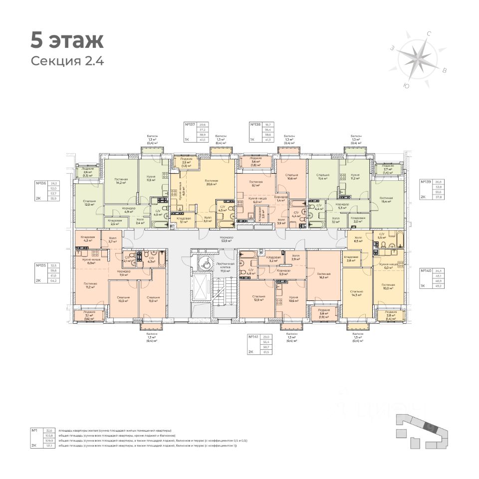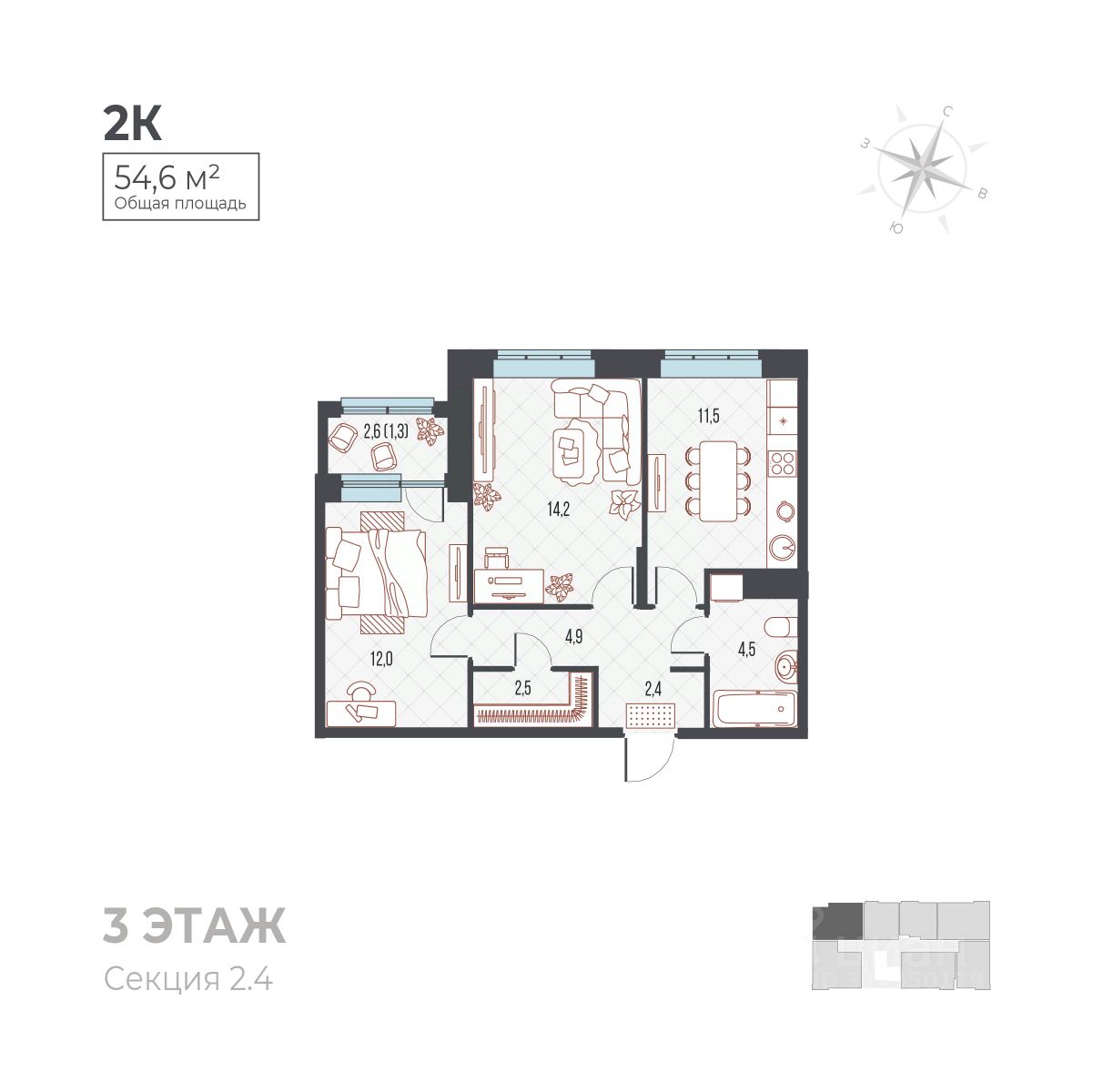 1 лоджия, 1 балкон