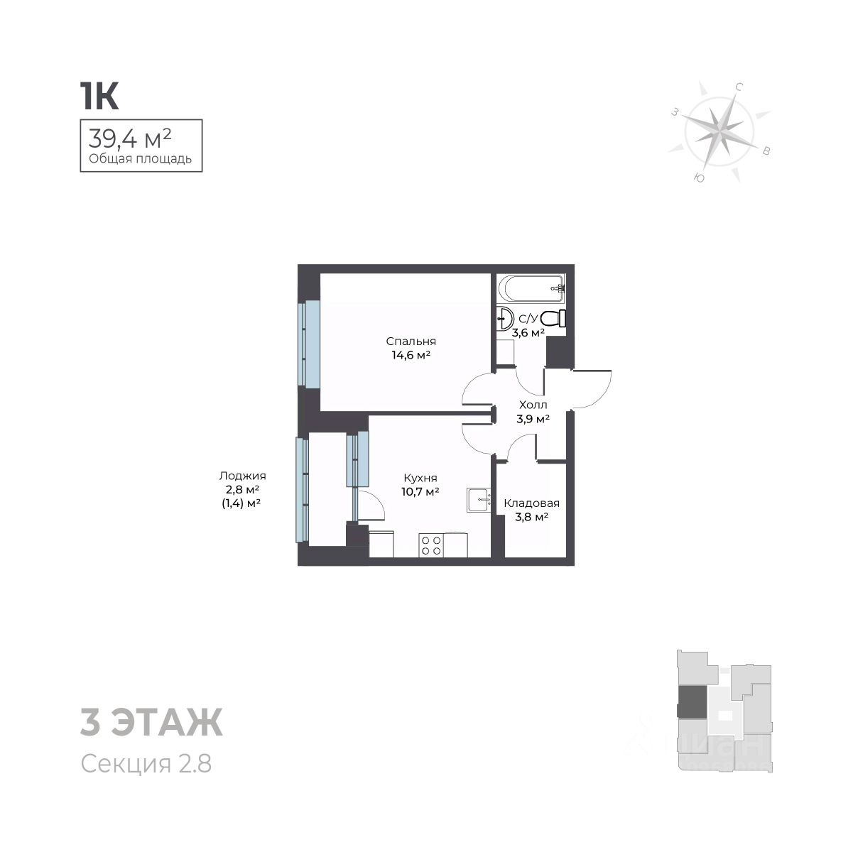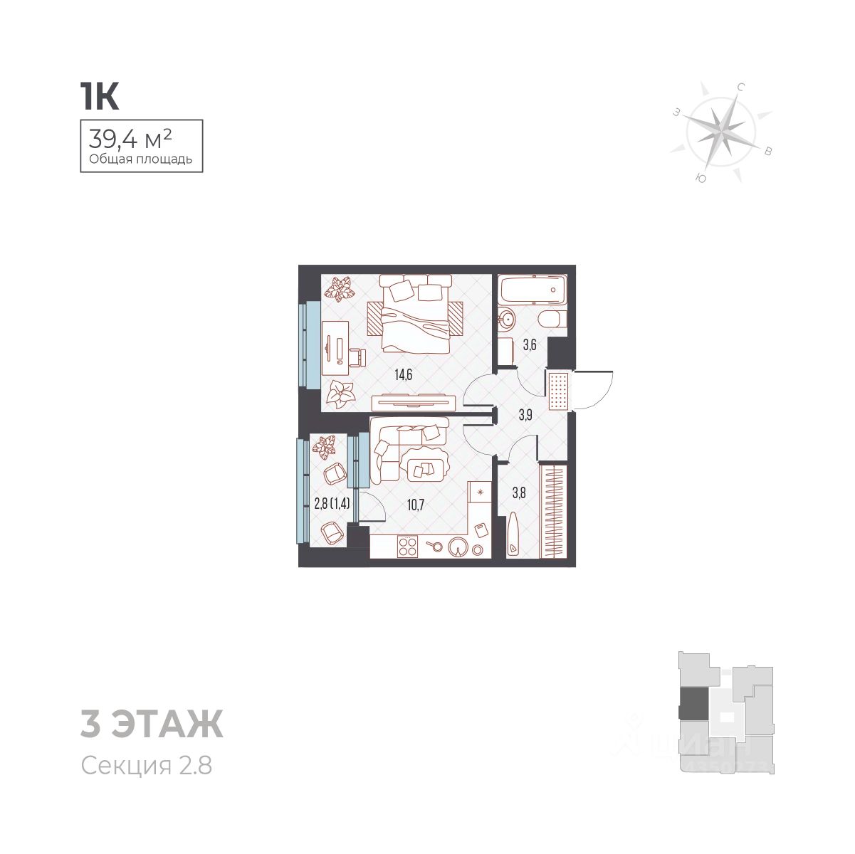 Общая площадь39,4 м²