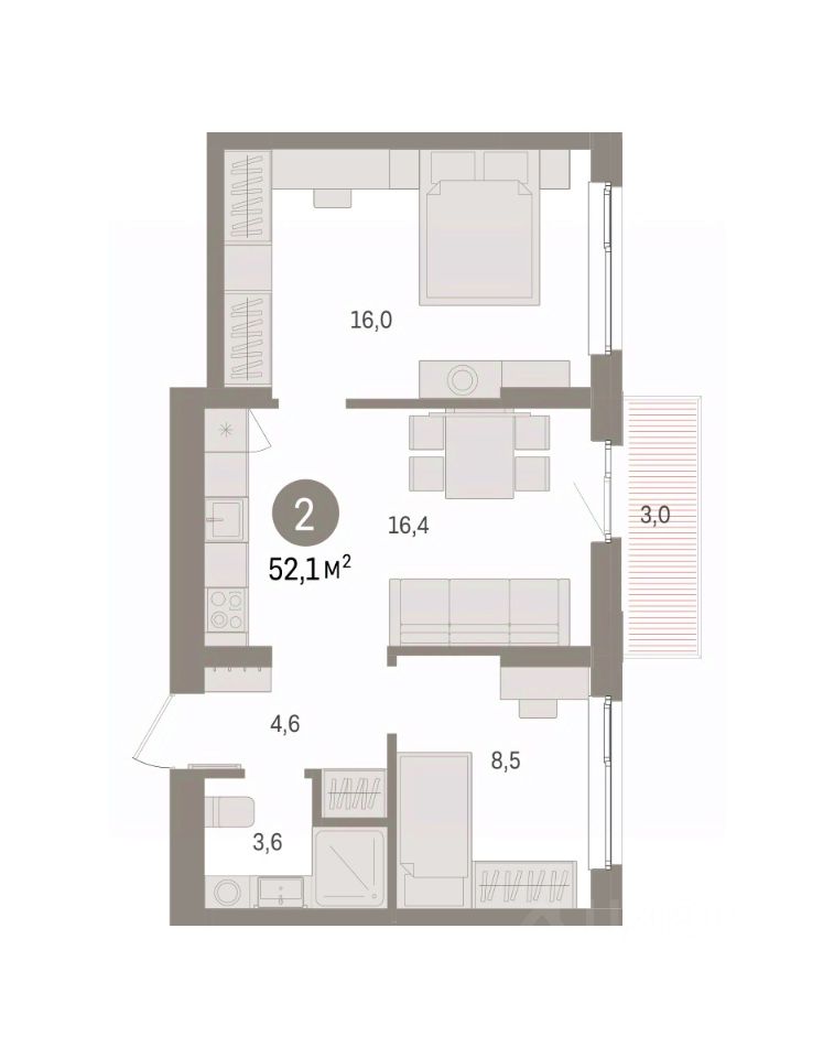 Двухкомнатная квартира от застройщика с предчистовой отделкой в ЖК "Квартал "Юность"" на 6 этаже. Общая площадь: 52.08 кв.м. Высота потолков 2.7 м.