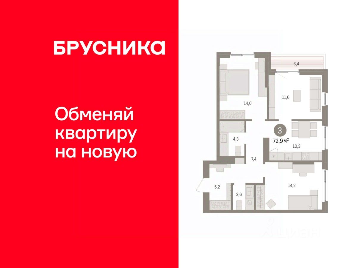 Трехкомнатная квартира от застройщика с предчистовой отделкой в ЖК "Квартал "Юность"" на 11 этаже. Общая площадь: 72.94 кв.м., жилая: 39.8 кв.м., площадь просторной кухни-гостиной: 10.3 кв.м. Угловая квартира, окна oбecпeчивaют paвнoмepнoe ocвeщeниe в тeчeниe дня. В квартире одна лоджия, один совмещенный и один раздельный санузел. Высота потолков 2.7 м.