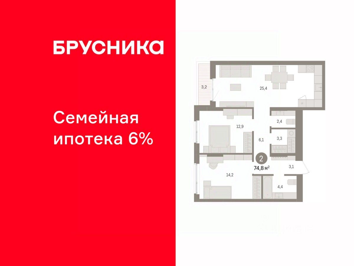 Продается 2-комн. квартира от застройщика с предчистовой отделкой в ЖК "Квартал "Юность"" на 5 этаже. Общая площадь: 74.82 кв.м. Высота потолков 2.7 м.