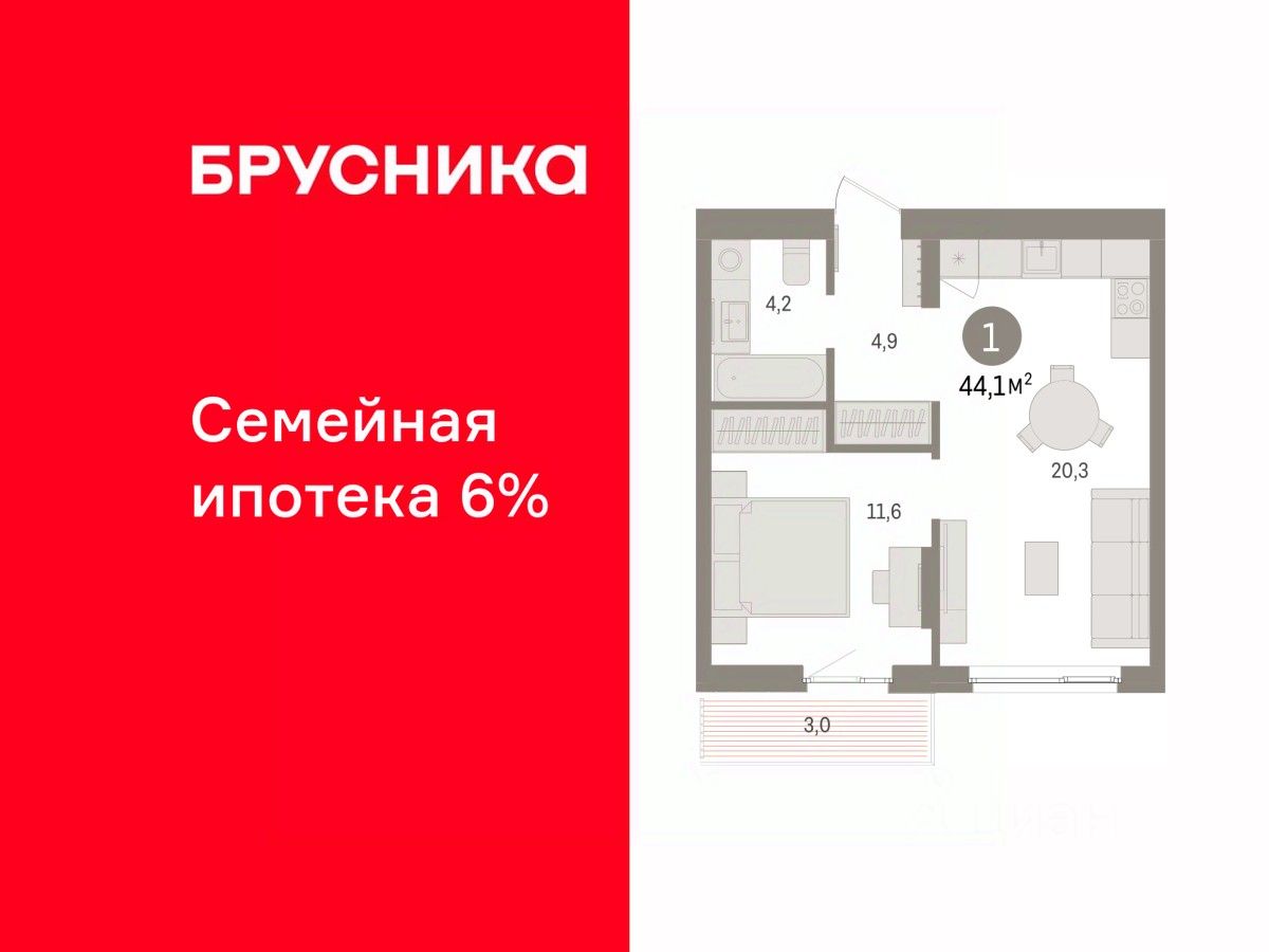 Квартира с кухней-гостиной и одной спальней в квартале "Юность". Особенности планировки: балкон.
