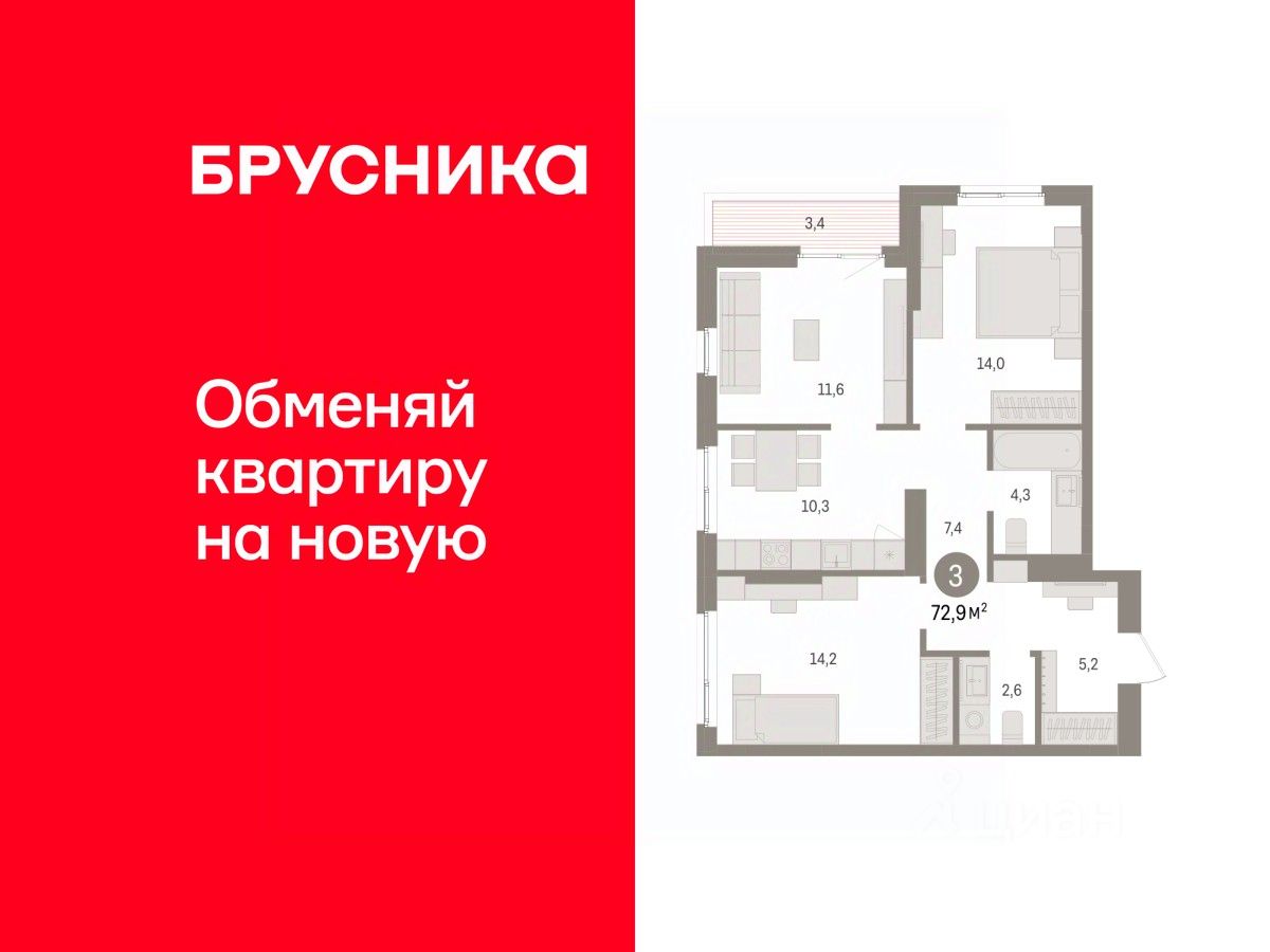 Квартира с кухней-гостиной и тремя спальнями в квартале "Юность". Особенности планировки: балкон, разнесённые спальни.