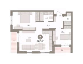 Квартира с кухней-гостиной и двумя спальнями в квартале "Юность". Особенности планировки: балкон, разнесённые спальни.