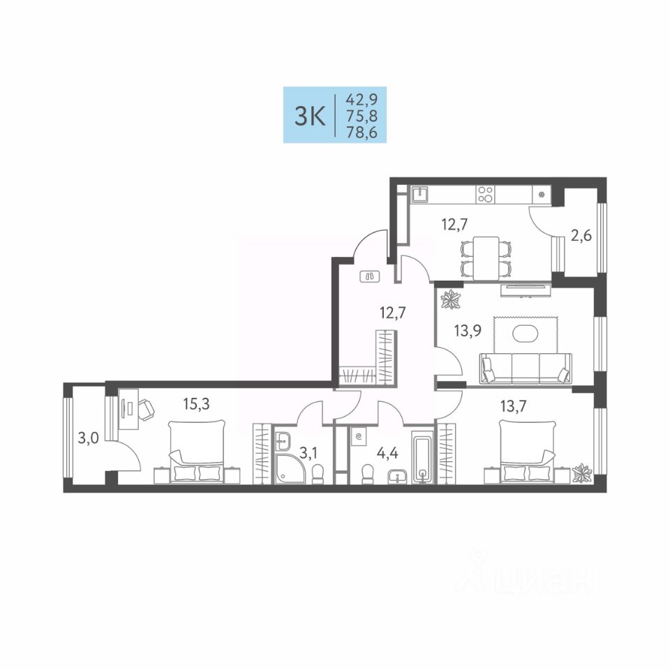 42,9 м²