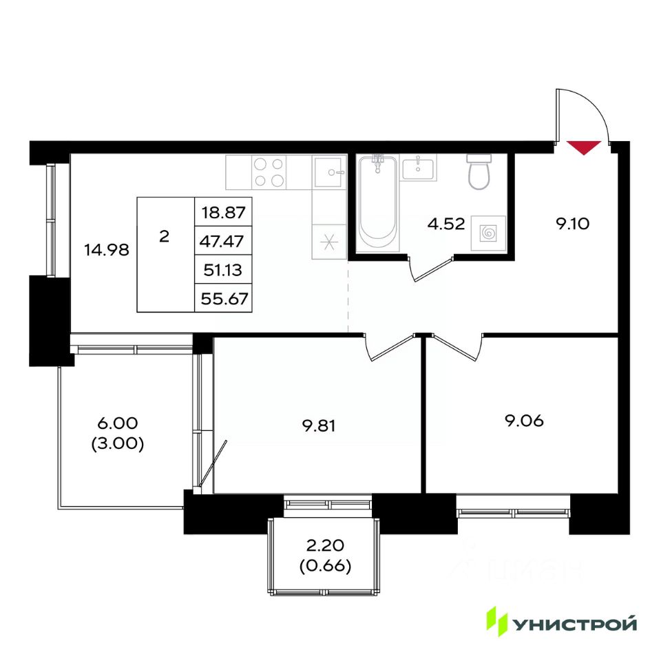 Общая площадь51,13 м²