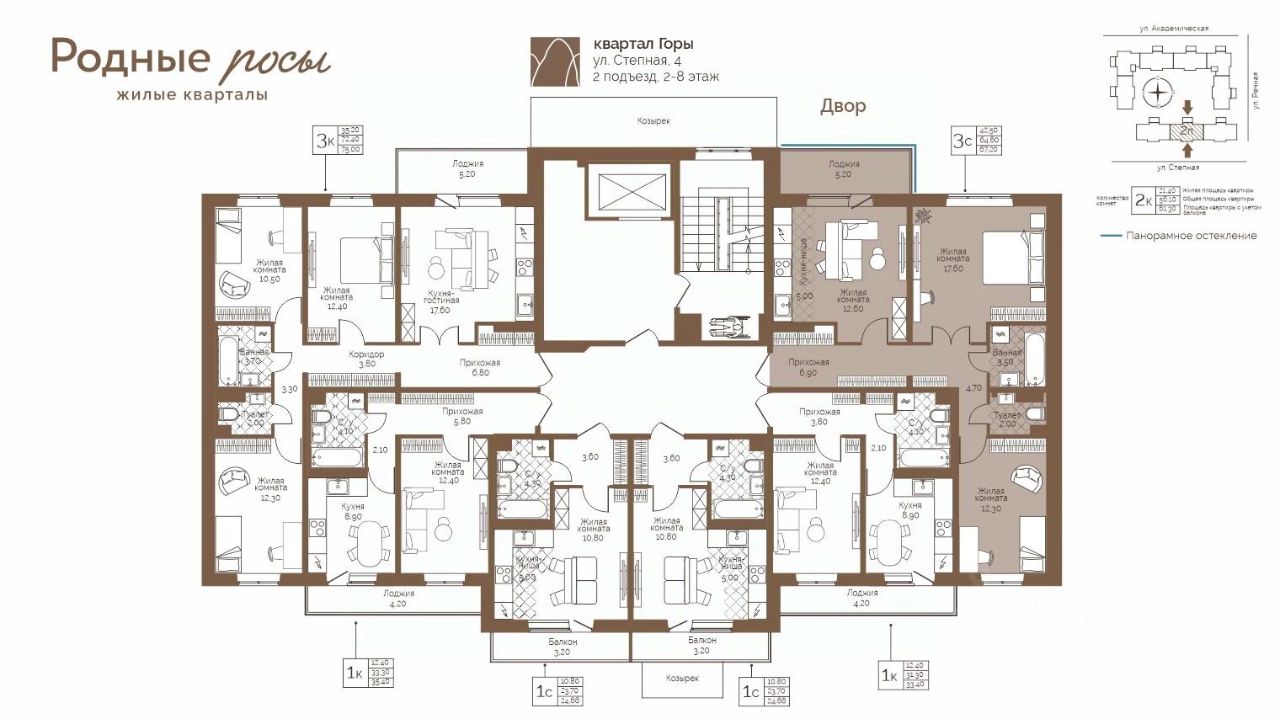Продаётся 3-комнатная квартира в строящемся доме (Степная, 2), срок сдачи: IV-кв. 2027, общей площадью 67.2 кв.м., на 2 этаже. Новый жилой комплекс "Родные росы" от Специализированного застройщика "Финпроект" расположен в с. Фролы по ул. Академическая.