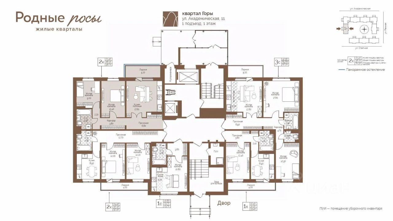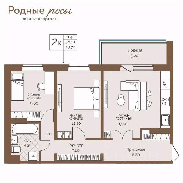 Продаётся 2-комнатная квартира в строящемся доме (Академическая, 9), срок сдачи: III-кв. 2027, общей площадью 58.7 кв.м., на 1 этаже. Новый жилой комплекс "Родные росы" от Специализированного застройщика "Финпроект" расположен в с. Фролы по ул. Академическая.