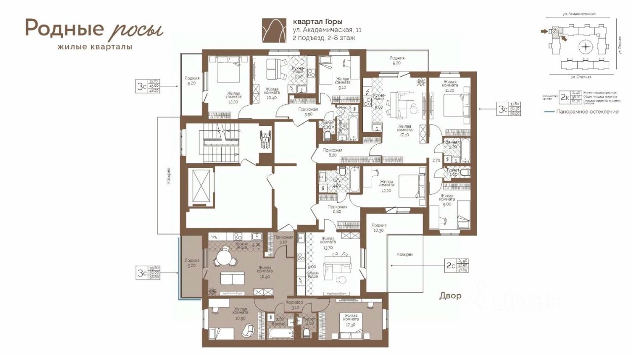 Продаётся 3-комнатная квартира в строящемся доме (Академическая, 9), срок сдачи: III-кв. 2027, общей площадью 58.6 кв.м., на 6 этаже. Новый жилой комплекс "Родные росы" от Специализированного застройщика "Финпроект" расположен в с. Фролы по ул. Академическая.