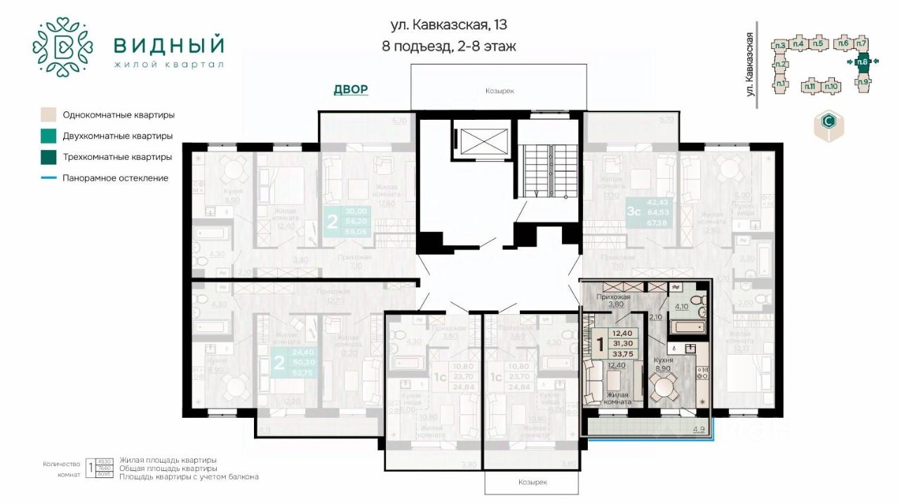Продаётся 1-комнатная квартира в строящемся доме (корпус 2 (Кавказская, 13к2)), срок сдачи: II-кв. 2028, общей площадью 33.75 кв.м., на 3 этаже. Новый жилой комплекс "Жилой квартал "Видный" от Специализированного застройщика "СПК-Кавказская" расположен по адресу: г. Пермь, ул. Кавказская, 13.