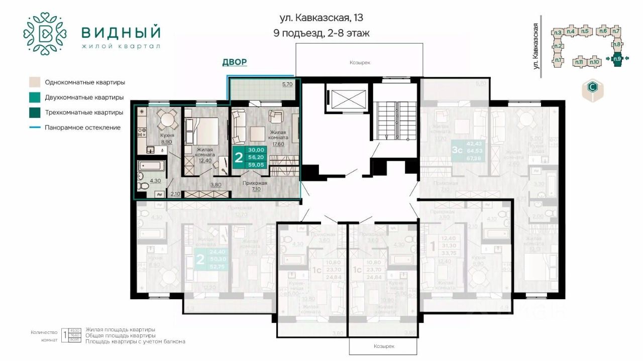 Продаётся 2-комнатная квартира в строящемся доме (корпус 2 (Кавказская, 13к2)), срок сдачи: II-кв. 2028, общей площадью 59.05 кв.м., на 3 этаже. Новый жилой комплекс "Жилой квартал "Видный" от Специализированного застройщика "СПК-Кавказская" расположен по адресу: г. Пермь, ул. Кавказская, 13.