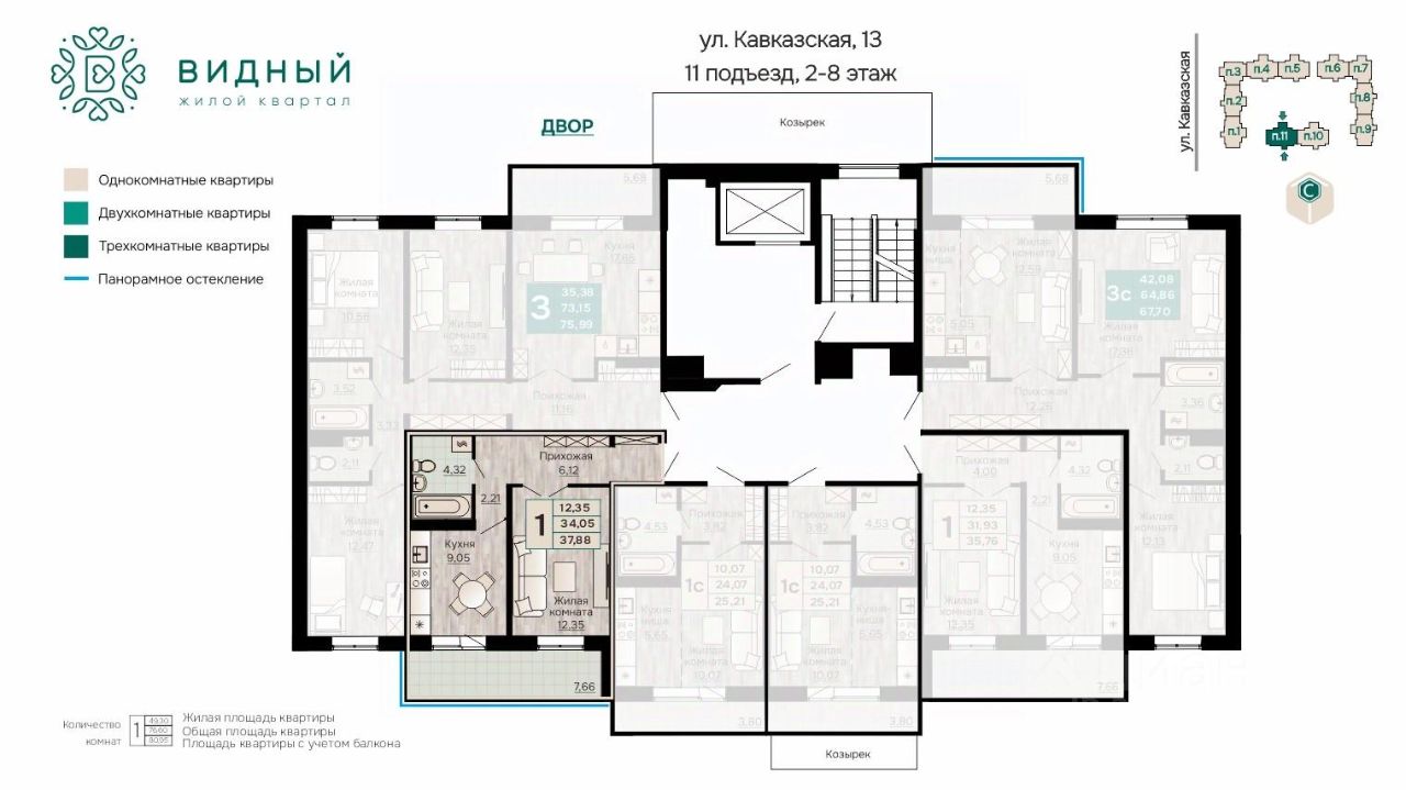 Продаётся 1-комнатная квартира в строящемся доме (корпус 2 (Кавказская, 13к2)), срок сдачи: II-кв. 2028, общей площадью 37.88 кв.м., на 6 этаже. Новый жилой комплекс "Жилой квартал "Видный" от Специализированного застройщика "СПК-Кавказская" расположен по адресу: г. Пермь, ул. Кавказская, 13.
