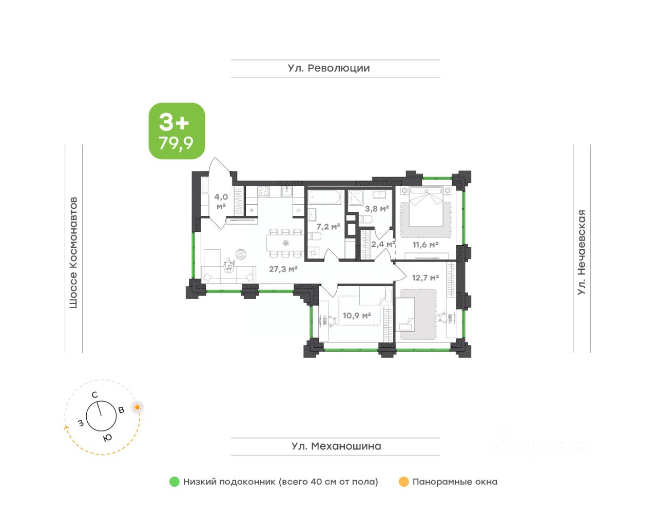 Окна выходят на четыре стороны — больше света, воздуха и ощущение открытого пространства;
