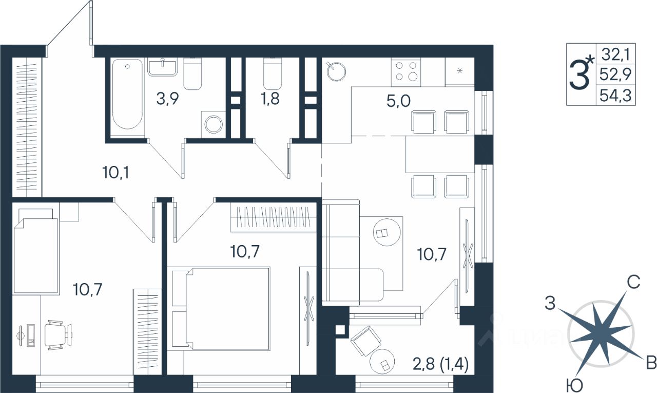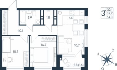54,3 м²