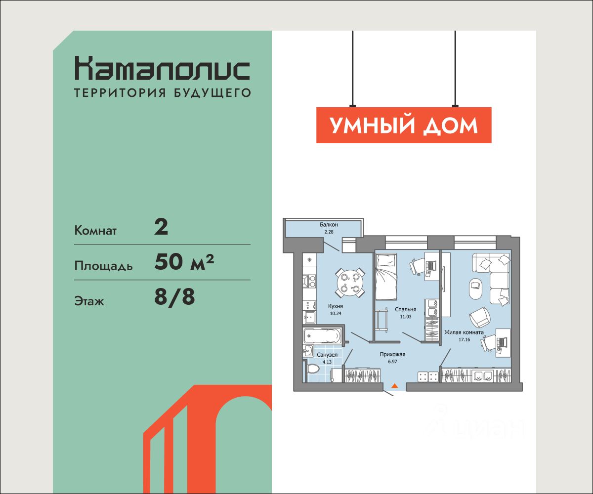 В новом жилом комплексе комфорт+ класса "Камаполис", расположенном на берегу реки Камы, продается 2-комнатная квартира площадью 50.00 кв. м. Квартира находится в 4 доме. Девелопер проекта - "Железно".