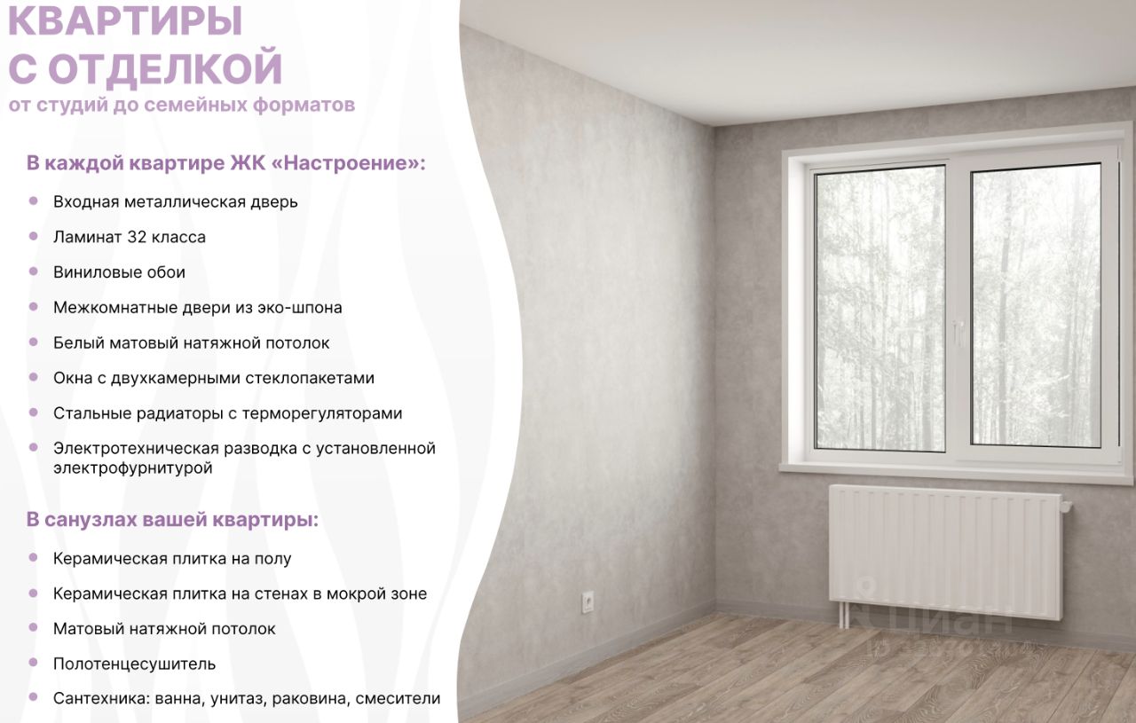Квартиры в ЖК Настроение сдаются с современной отделкой готовой для жизни.